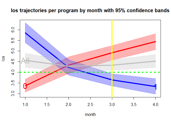 gr1 <- group(x="program", y="los", z="month", data=hosprog, dist="t", increment=3, rolling=6)