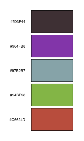 iwanthue(5, 0, 360, 54, 180, 27, 67, plot=TRUE) # pimp