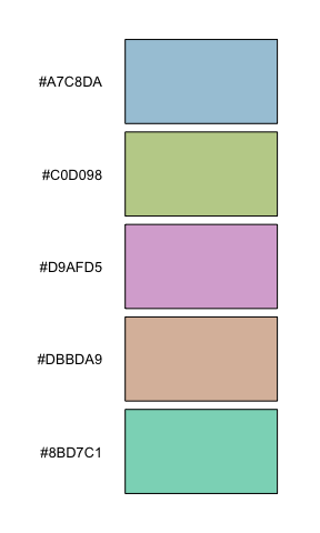 iwanthue(5, 0, 360, 0, 54, 67, 100, plot=TRUE) # pastel