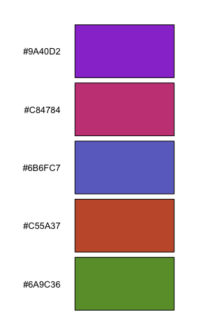 iwanthue(5, 0, 360, 36, 180, 13, 73, plot=TRUE) # intense