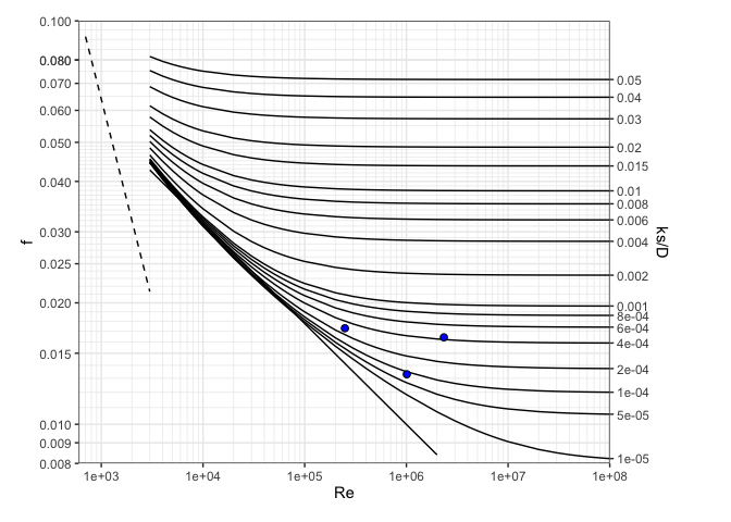 #> Water density: 997.075 kg/m3moody(Re = c(ans1$Re, ans2$Re, ans3$Re), f = c(ans1$f, ans2$f, ans3$f))