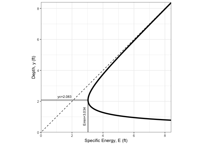 cat(sprintf("Slope: %.5f ft\nCritical depth: %.2f\n", oc3$Sf, oc3$yc))