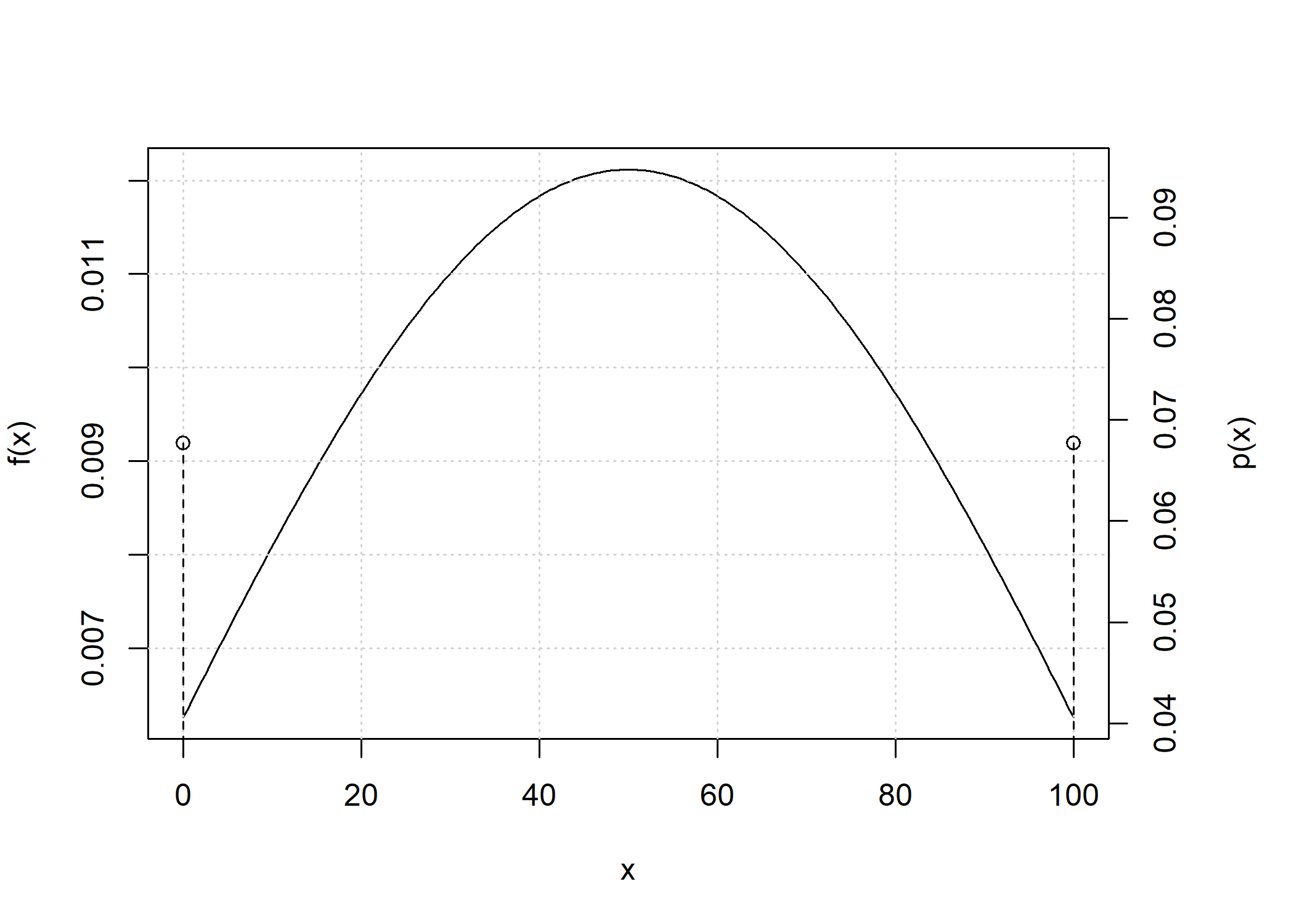 The distribution has two point masses (no IBD at all and fully IBD) and admits a density function otherwise. A plot includes both components.
