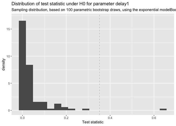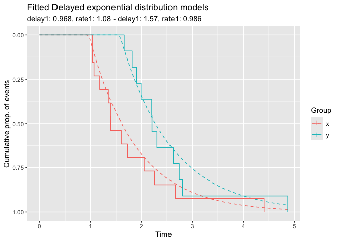 y <- rexp_delayed(n = 11, delay1 = 1.5, rate1 = 1.2)We use the model function delay_model to fit an