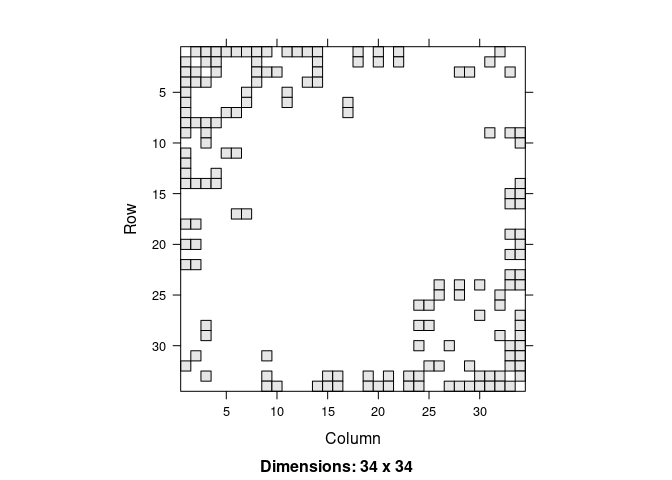 Here we show how invertiforms might help you quickly perform regularized spectral clustering. First we grab some network data and quickly visualize the adjacency matrix.