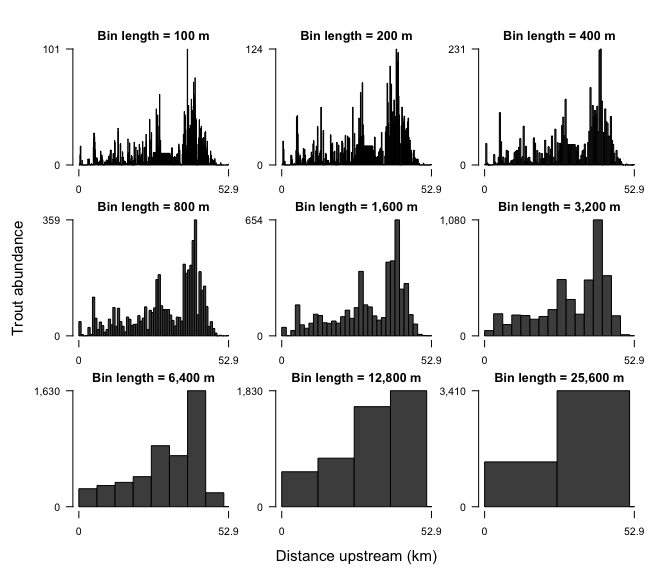 Longitudinal profiles of trout abundance throughout the Quinault River, Washington, USA plotted at a range of bin lengths.