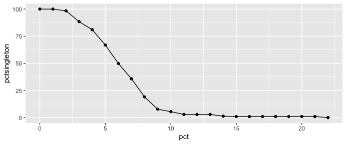 ggplot(x, aes(x=pct, y=pctsingleton)) + geom_line() + geom_point()