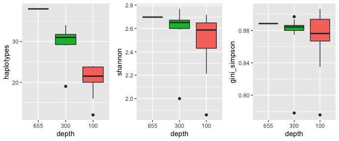 xlab("depth") + theme(legend.position = "none")plot_grid(haplotypes, shannon, gini_simpson, nrow = 1)