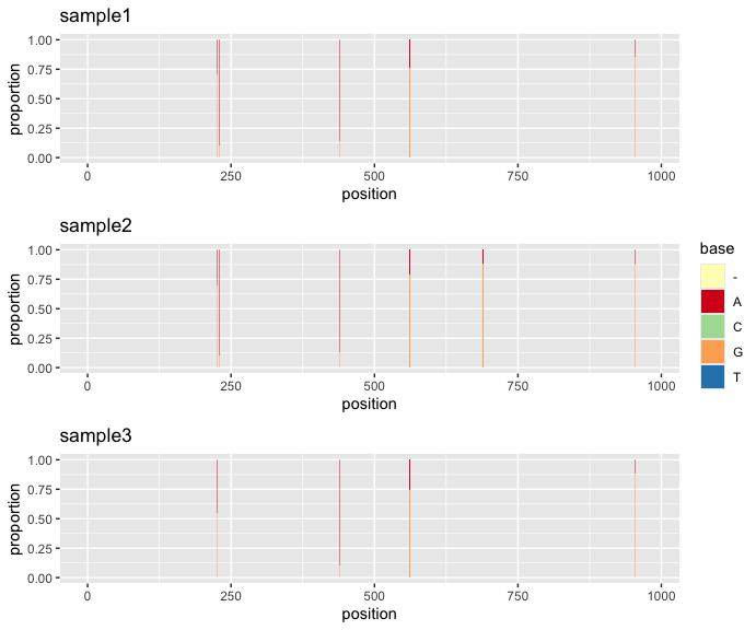 This plot shows that SNV positions are well-aligned between three samples. In some cases, SNV plot can highlight sequencing error concentrating at a particular range in read alignment like the additional sample added to the following example.