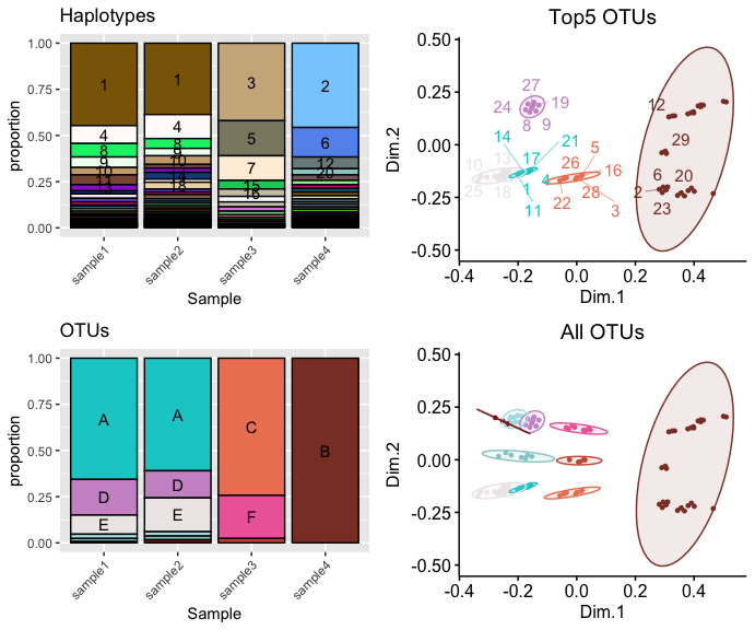 The summary plot comprises four main subplots. First, the haplotype plot at the top left displays all unique haplotypes and their proportions across all samples. Second, the operational taxonomic unit (OTU) plot at the bottom left groups genetically closely related haplotypes into new OTUs through k-means clustering on a multidimensional scale (MDS) of all samples’ pairwise SNV distances. Third, the MDS plot at the top right visualizes the genetic relationships and clustering scheme of the five largest OTUs and haplotypes belonging to each OTU. Fourth, the MDS plot at the bottom right shows all classified OTUs.