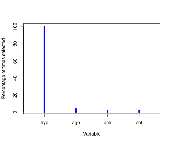plot(y$percfreq, type = "h", main = "", xlab = "Variable", ylab = "Percentage of times selected",
