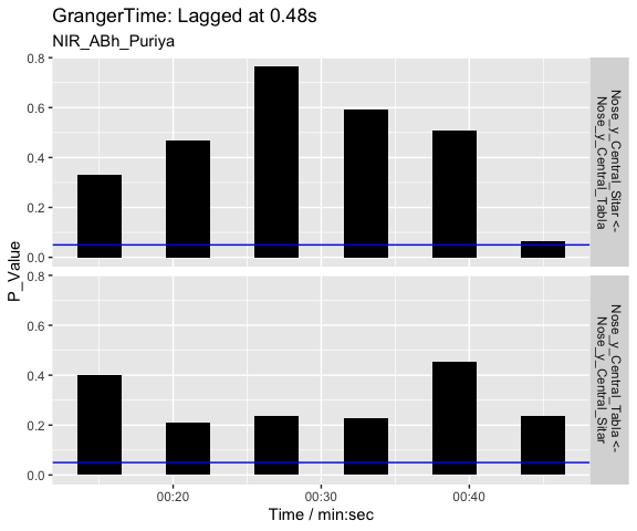 As we can see from the visualisation, there is not much causality taking place between the two performers as evidenced by the high p values. The last segments suggest a weak causality where sitar can be seen driving the tabla. The interpretation of these 30-second segments of the vertical head movement is challenging, especially when we know that the sitar player is the only musician producing sounds during these first 60-seconds of the opening alap. The tabla player may still be reacting to the performance of the sitar player and coordinating actions through performance cues (gaze) during the opening section.