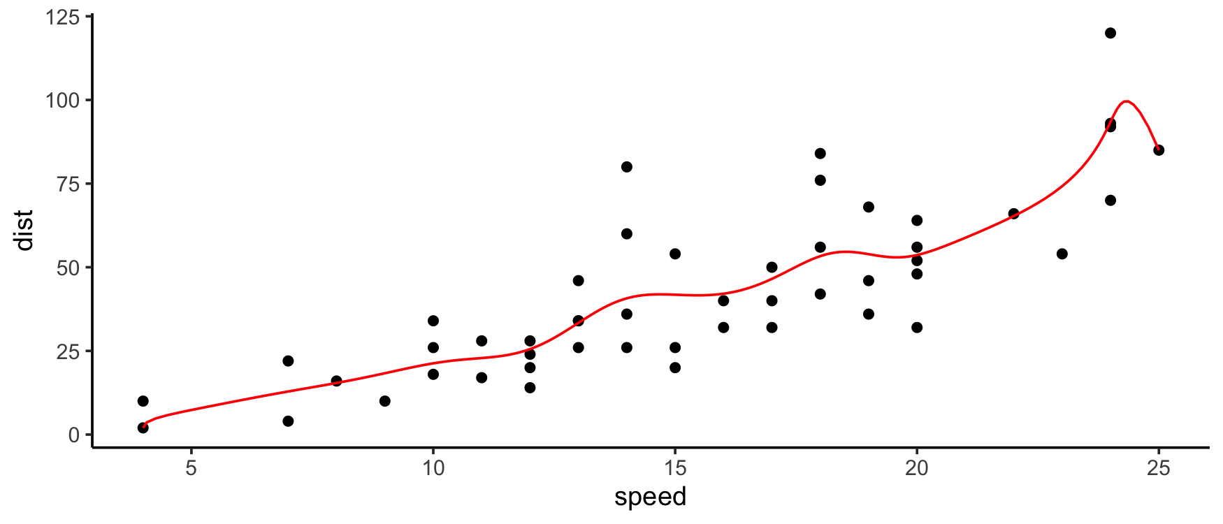 qplot(speed, dist, data = cars) +