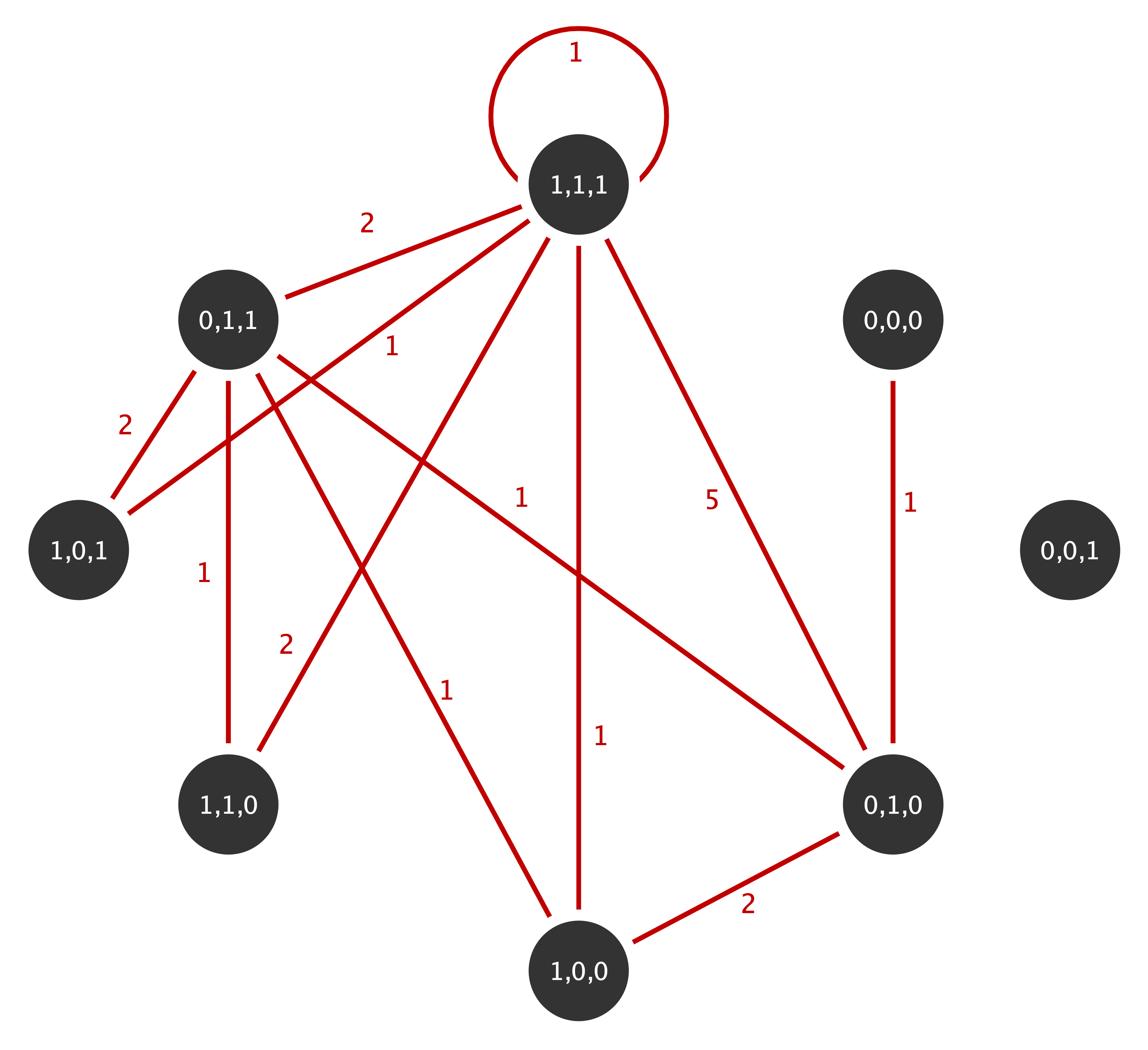 0, 0, 0, 0, 0, 0, 0, 1), nrow= 8, ncol=8))The equivalence of adjacency matrix for the multigraph is given by