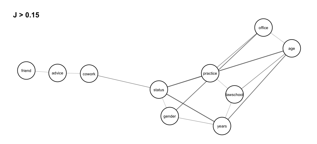 df.att <- lawdata[[4]]A requirement for the applicability of these entropy tools is the specification of discrete variables with finite range spaces on the same domain: either node attributes/vertex variables, edges/dyad variables or triad variables. These can be either observed or transformed as shown in the following using the above example data set.