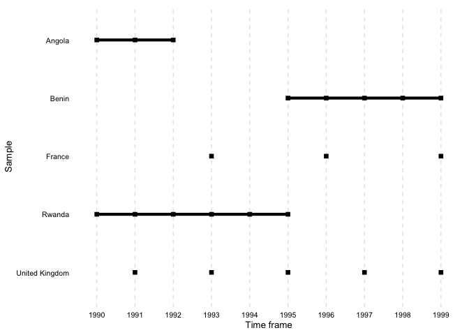output_table <- overview_tab(dat = toydata, id = ccode, time = year)The resulting data frame collapses the time condition for each id by