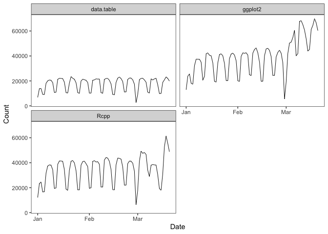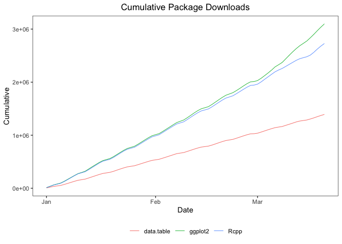 cranDownloads(package = "ggplot2")> date package count cumulative