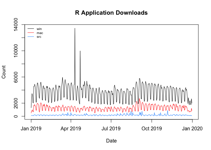 cranlogs::cran_downloads(package = "R"), is, with two