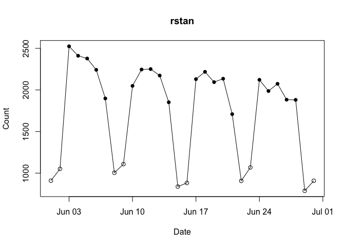 cranDownloads(package = "rstan", to = 2026)Note that the Posit/RStudio logs begin on 01 October 2012.