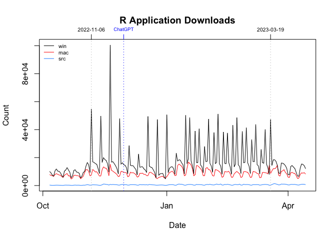 However, between November 2022 and March 2023, this pattern was broken. On Sundays (06 November 2022 - 19 March 2023) and Wednesdays (18 January 2023 - 15 March 2023), there were noticeable, repeated, orders-of-magnitude spikes in the daily downloads of just the Windows version of R.