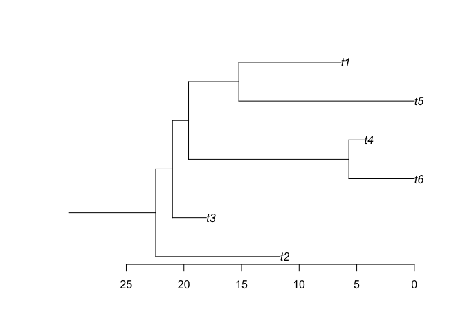 phy <- make.phylo(sim) # make a phylogenetic tree with the simulated group