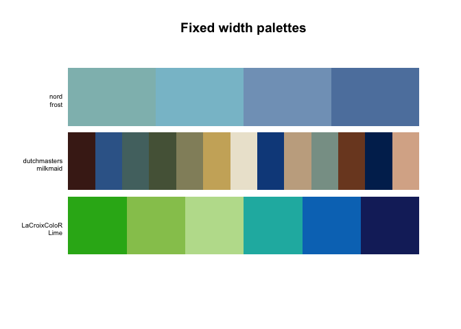 devtools::install_github("EmilHvitfeldt/paletteer")The palettes are divided into 2 groups; discrete and continuous. For discrete palette you have the choice between the fixed width palettes and dynamic palettes. Most common of the two are the fixed width palettes which have a set amount of colors which doesn’t change when the number of colors requested vary like the following palettes:
