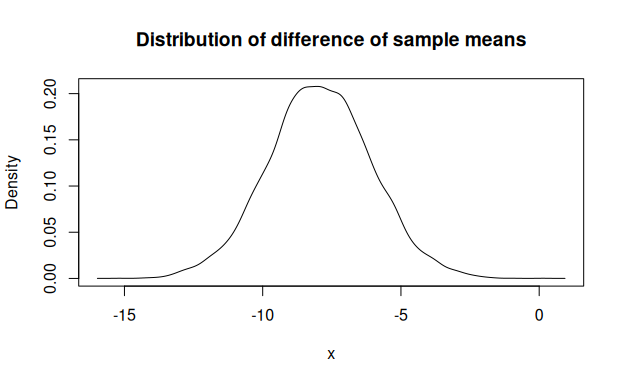 #> [1] 20.19375Compute and visualize distribution of difference of sample means: