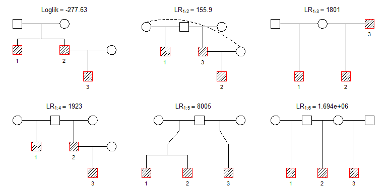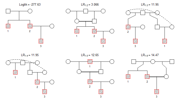 The most likely pedigree is plotted top left. The titles for the remaining pedigrees give the likelihood ratio (LR) comparing the first pedigree to the one shown. For example, the first solution is 155.9 more likely than the second.