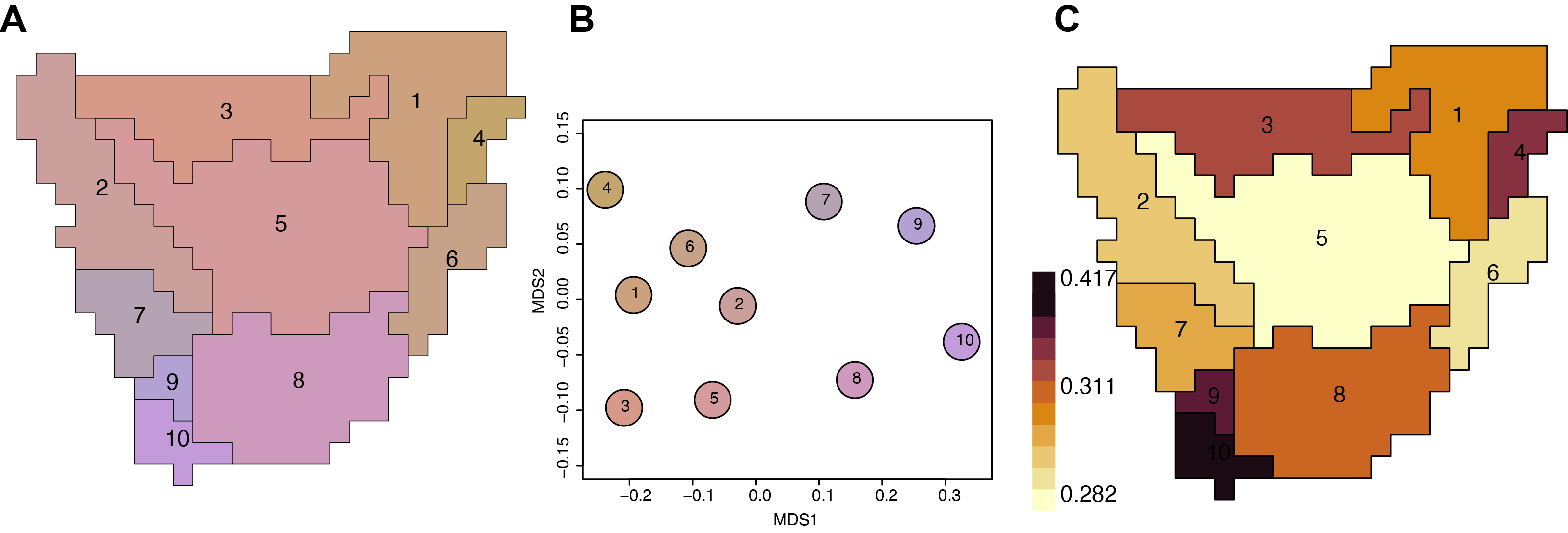 Daru, B.H., Karunarathne, P. & Schliep, K. (2020) phyloregion: R package for biogeographic regionalization and macroecology. Methods in Ecology and Evolution 11: 1483-1491. doi: 10.1111/2041-210X.13478.