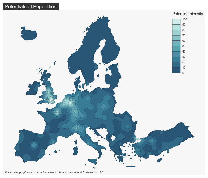 This package provides functions to compute the potential model as defined by Stewart (1941). Several options are available to customize the model, for example it is possible to fine-tune the distance friction functions or to use custom distance matrices. Some computations are parallelized to improve their efficiency.