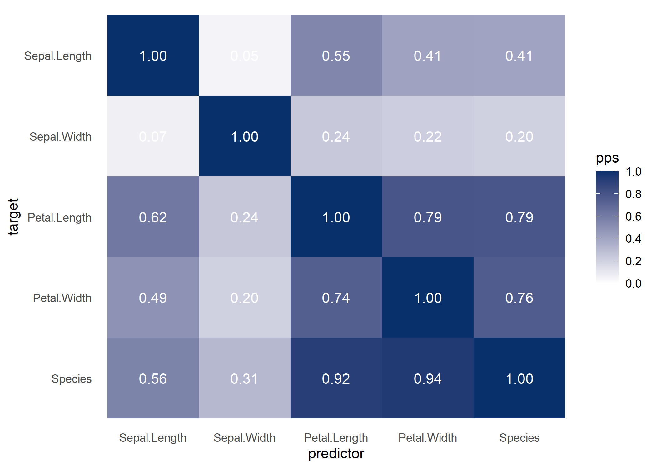 #> 9   Petal.Width  Sepal.Width            predictive power score 0.21746588