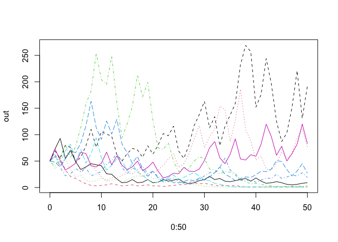 out <- PopSim(Rs=lambdas, years=50, N0=50)