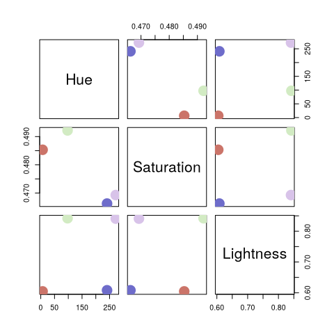 Or it might be plotted in one of the provided color spaces as a scatterplot matrix.