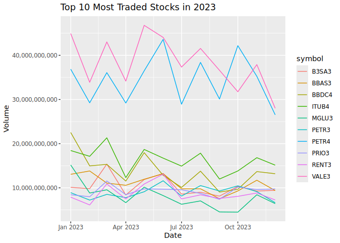 #> [10] "MGLU3"# Plot the most traded stocks grouped by month