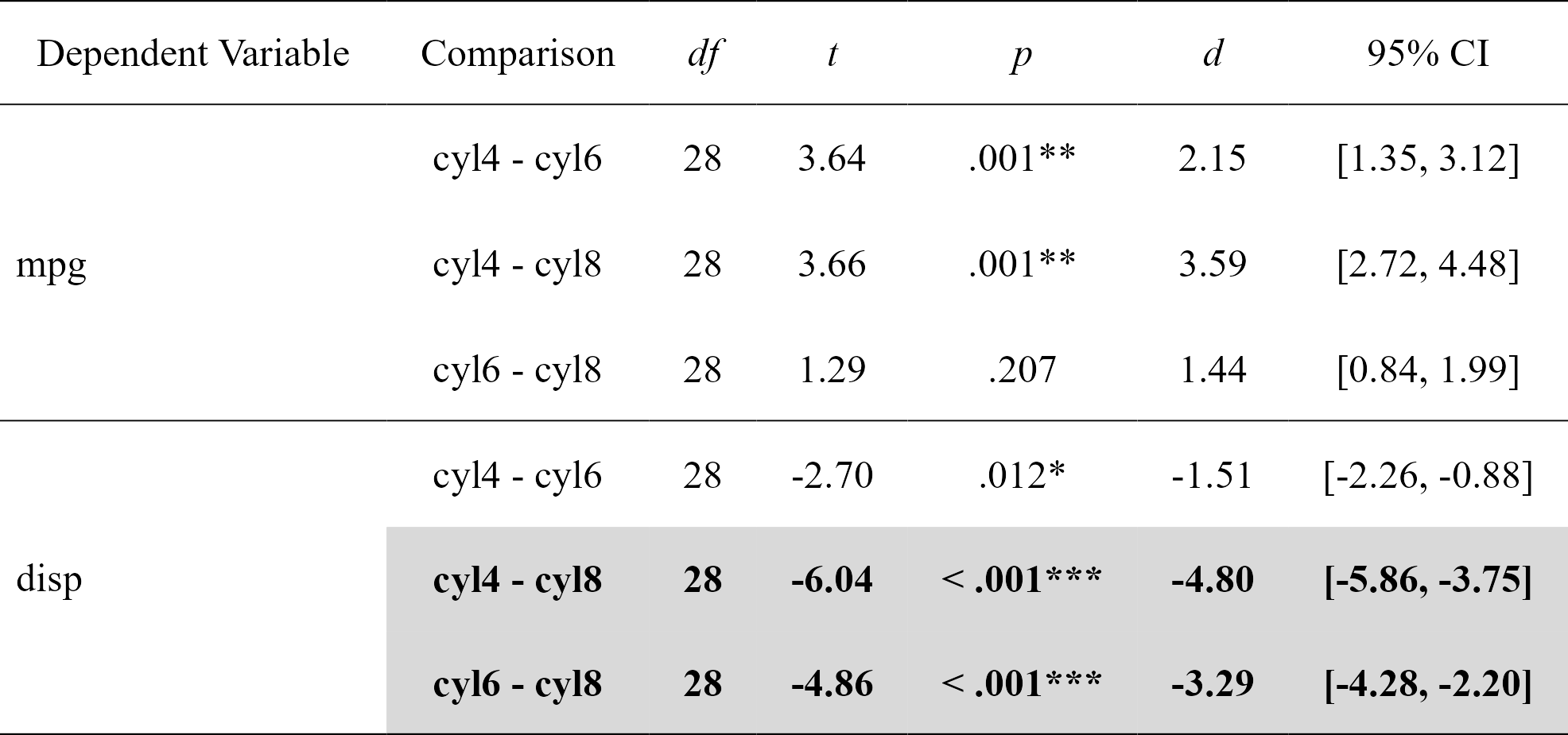#> 3 mpg cyl6 - cyl8 28 1.290359 0.207480642577 1.440495