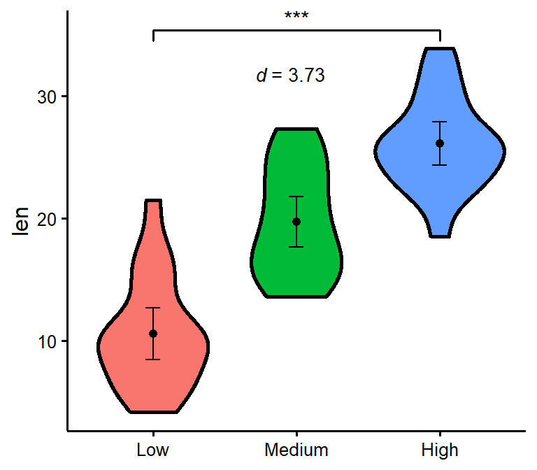 nice_contrastsEasily compute regression with planned contrast analyses (pairwise comparisons similar to t-tests but more powerful when more than 2 groups), and format in publication-ready format. Supports multiple dependent variables at once (but supports only three groups for the moment). In this particular case, the confidence intervals are bootstraped around the Cohen’s d.