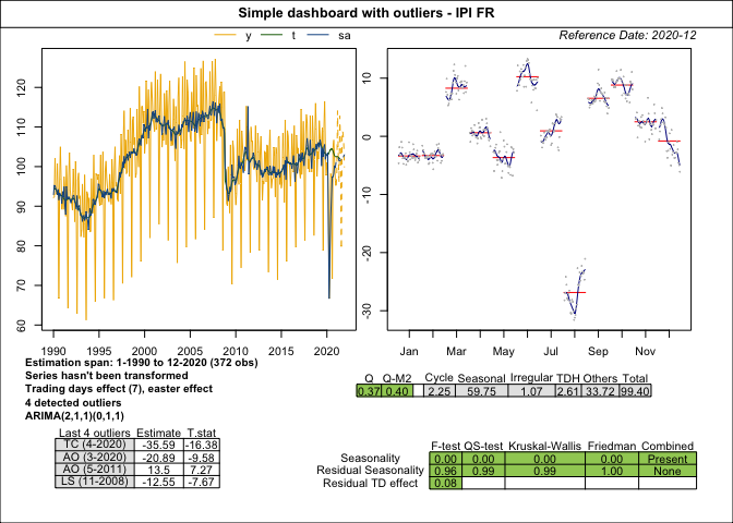 rjdqa is an extension of the R package RJDemetra, which is an interface to JDemetra+, the seasonal adjustment software officially recommended to the members of the ESS and the European System of Central Banks.