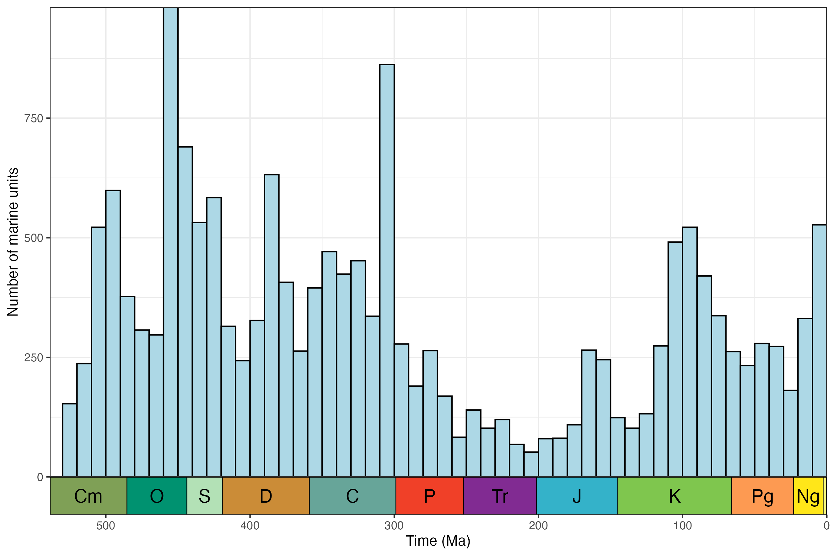 A minimal example of getting and plotting the number of marine units through time for North America: