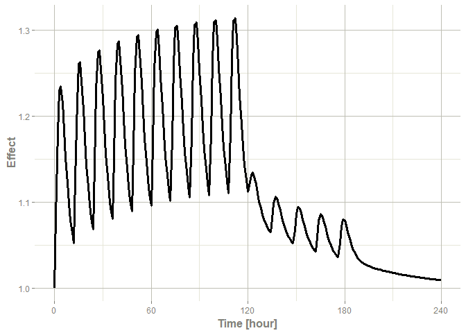 Note that the labels are automatically labeled with the units from the initial event table. rxode2 extracts units to label the plot (if they are present).