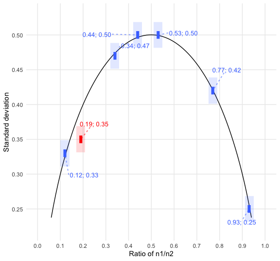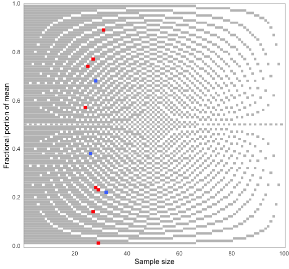 #> 6 0.554 150 FALSE 0.85You can choose how the means are reconstructed for testing — below, rounded up from 5. When visualizing results, the plot will adjust automatically. Blue dots are consistent values, red dots are inconsistent ones: