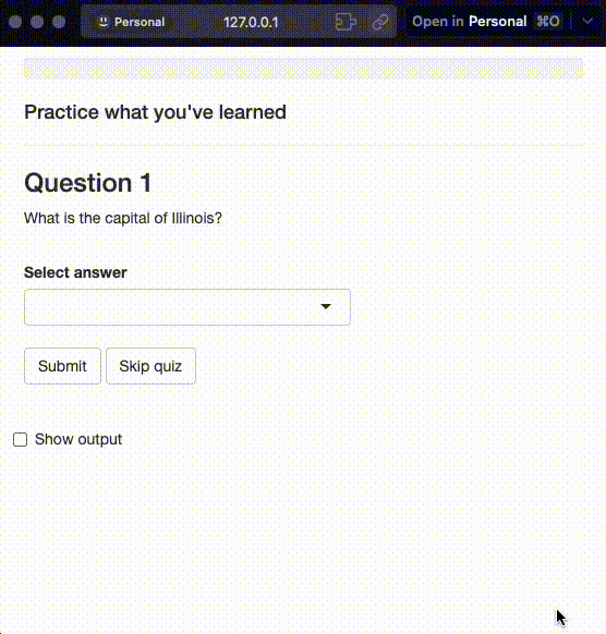 shinyquiz is excellent for developing short, informal quizzes with a priority of showing one question at a time. At the end of each question, users are notified if their answer is correct. Once the quiz ends, a summary page shows the user’s grade, their answer, and the correct answer.