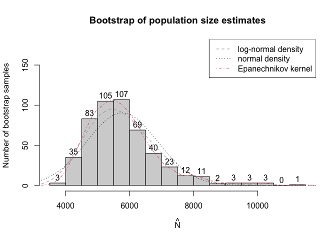 #> logNormal 20.66688 48.68564and the option to estimate standard error of population size estimate by bootstrap, models with more than one distribution parameter being dependent on covariates and some non standard link functions for example: