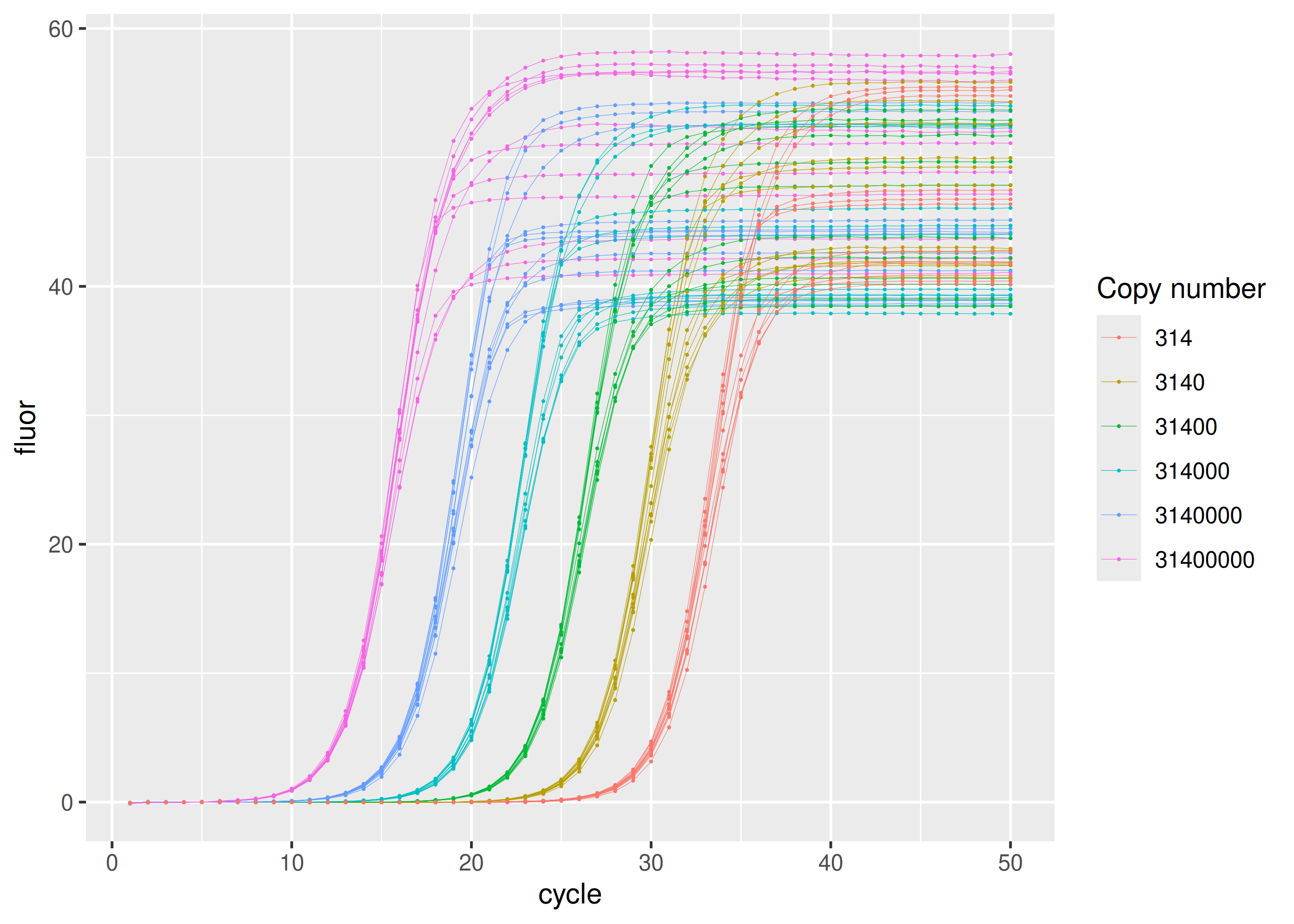 #> 32 tannic acid tannic acid 0.1 31400 1000 6Most concentrated set of samples in the dilution series have \(3.14 \times 10^7\) copies of the NADH dehydrogenase 1 (MT-ND1) amplicon. Following samples in the series are ten-fold dilutions.