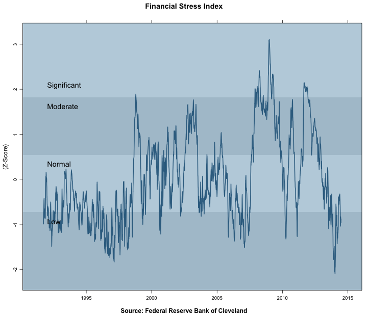 The R package stressr provides convenient access to the financial stress index and components data provided by the Federal Reserve Bank of Cleveland. The package provides data download functions and some representative plots along the same categories as provided by the bank. See the FRB’s terms of use regarding these data.