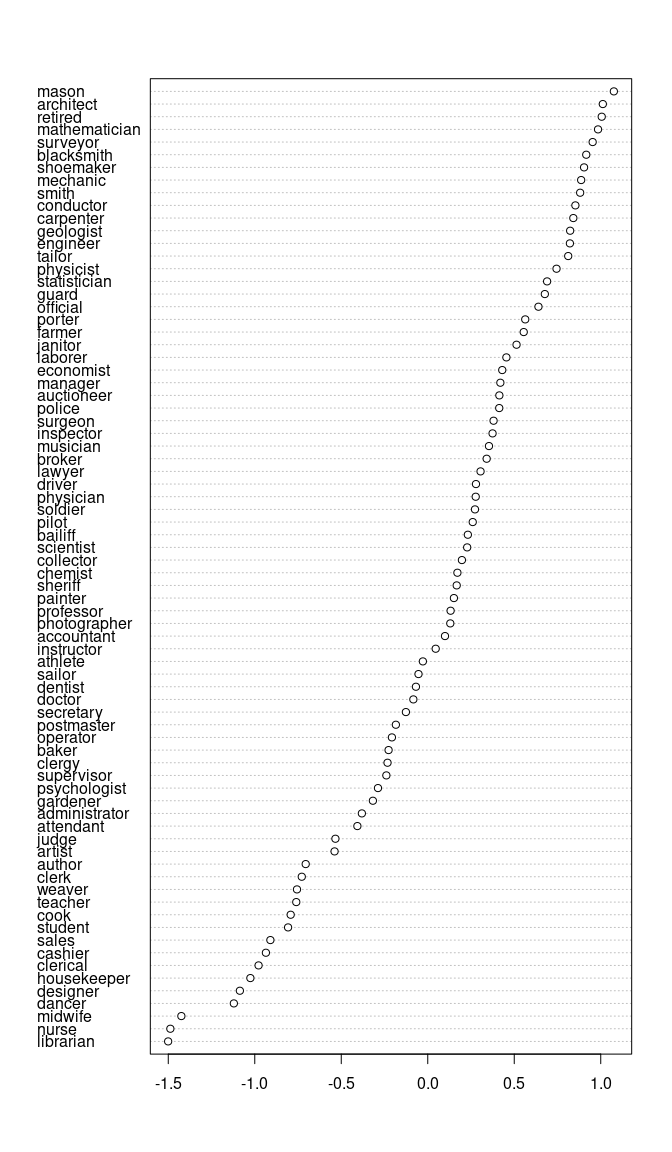 #>         mason        police   housekeeper        sailor      musician