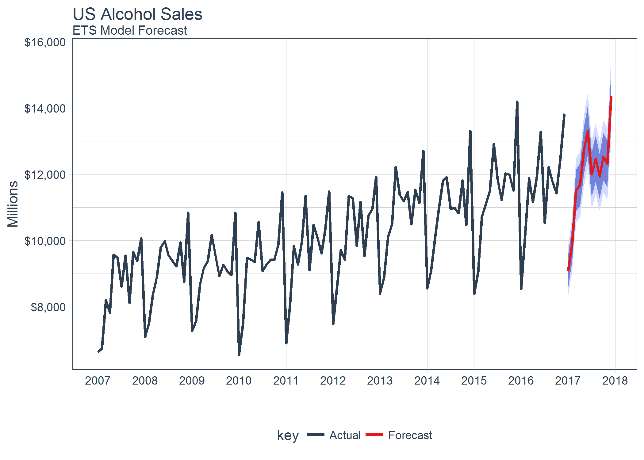 sweep enables converting a forecast object to tibble. The result is ability to use dplyr, tidyr, and ggplot natively to manipulate, analyze and visualize forecasts.