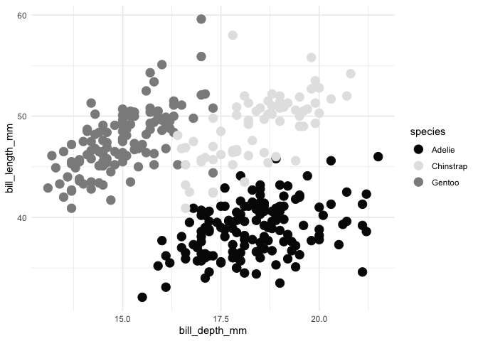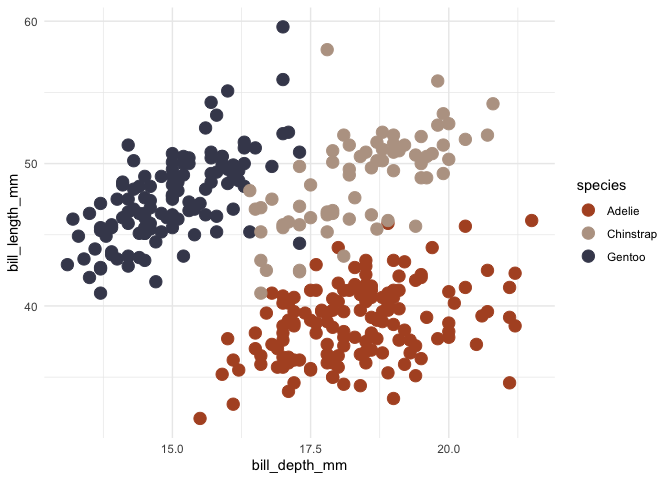 ggplot(penguins, aes(bill_depth_mm, bill_length_mm, color = species)) +