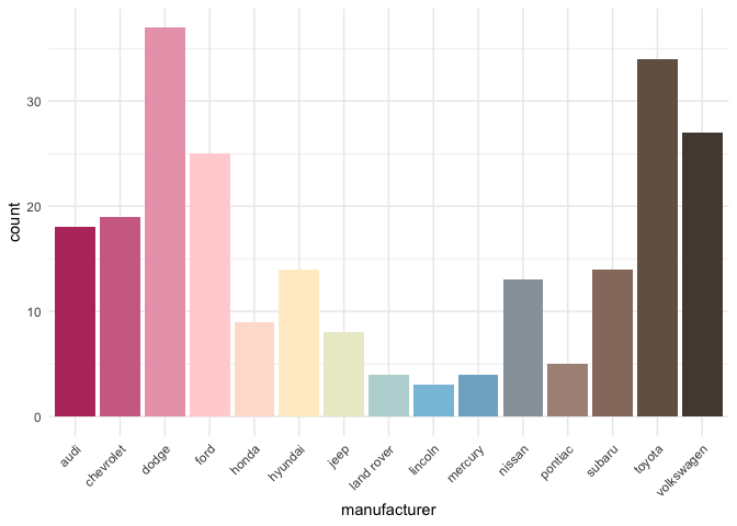 ggplot(mpg, aes(manufacturer, fill = manufacturer)) +