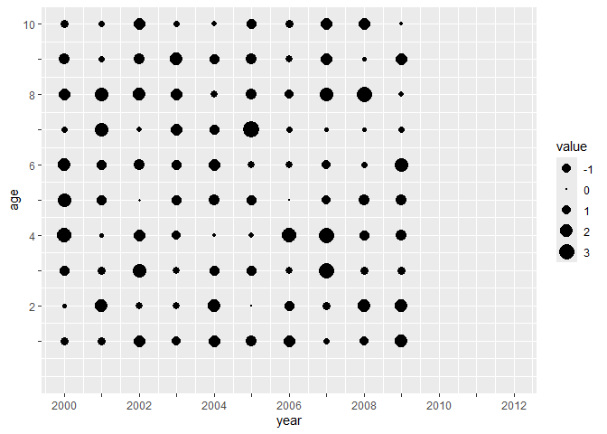 ggplot(aes(year, age, size=value)) +