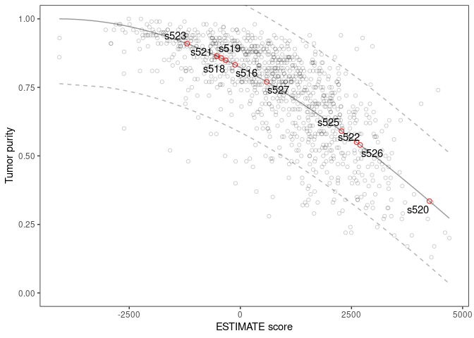 #> MMP2 7.6182 8.0369 8.9551 10.3875 7.4141Tumor purity can be predicted like so: